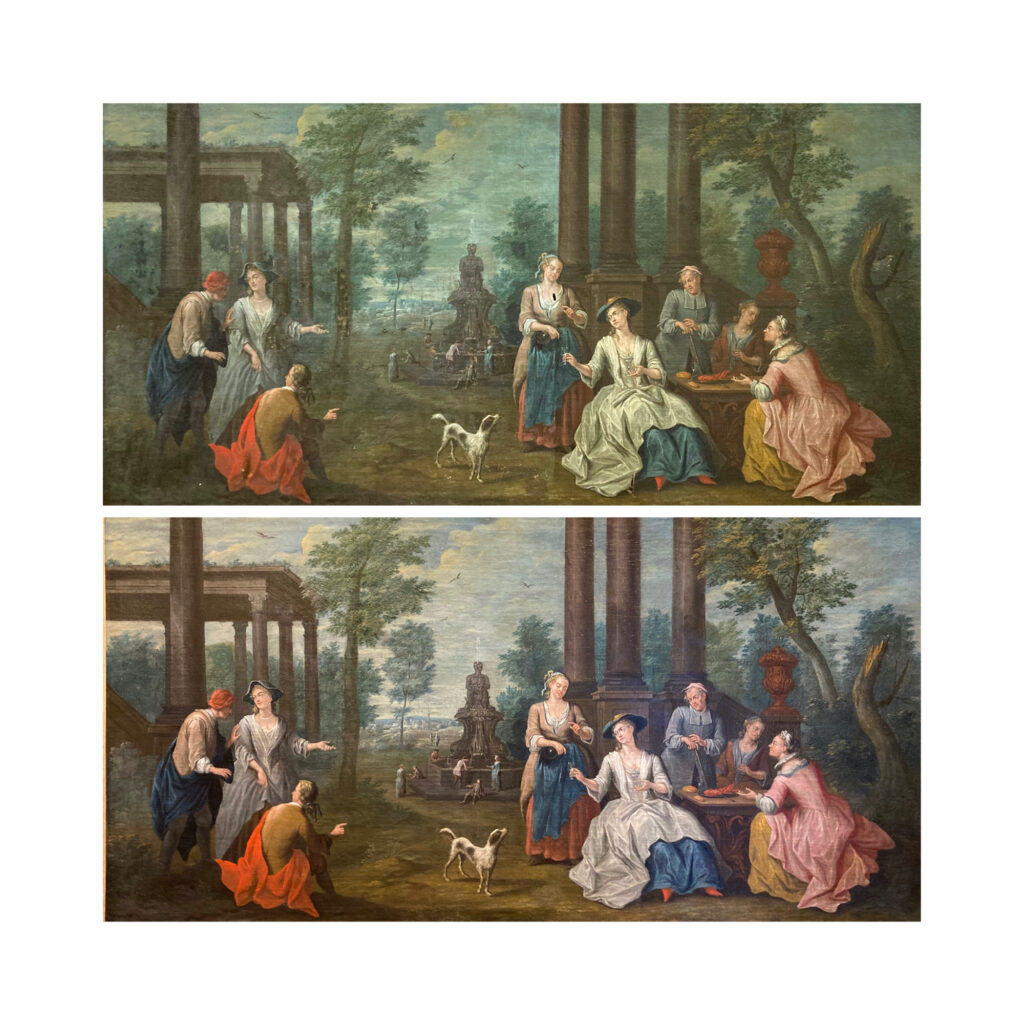 Fête Galante XVIIIème, sept reprises de déchirures et un dévernissage satisfaisant