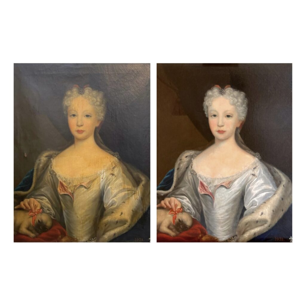 Portrait de Maria-Barbara de Bragança : dégagement d’un jus jaunâtre au dessus du vernis