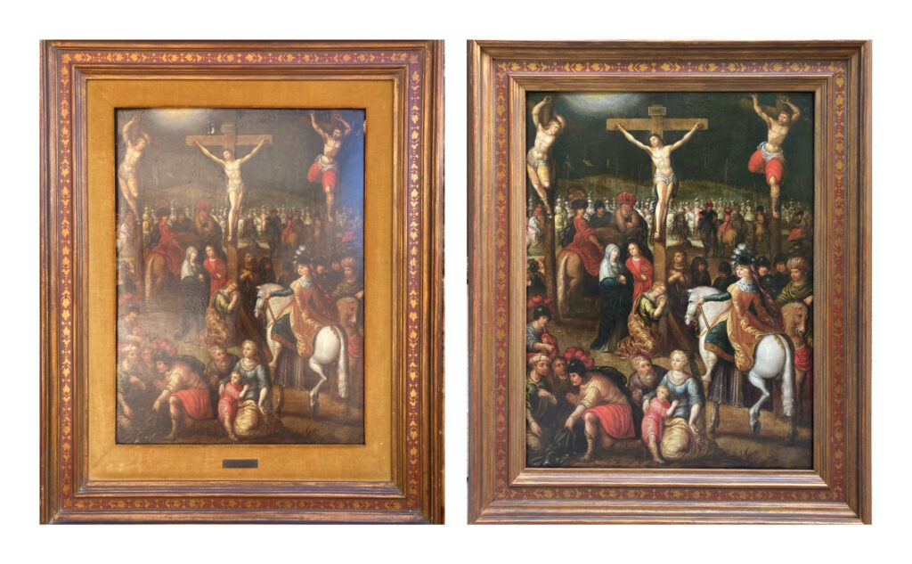 Crucifixion sur panneau de bois, travail esthétique et reprise d’une fente